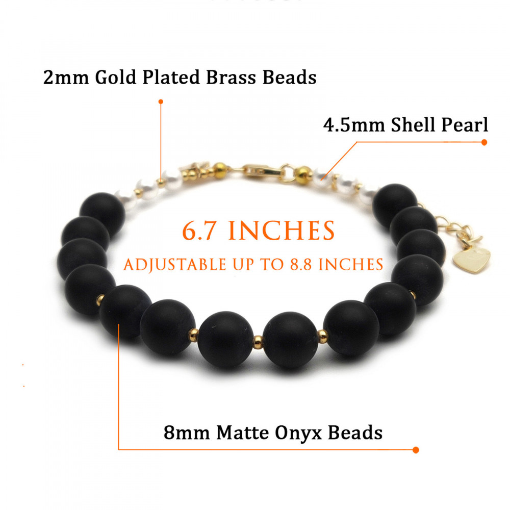 - MATERIAL : Natural black matte onyx and sea shell pearl loose beads charm bracelets, it's looks mysterious and charming, real gold plated brass accessories.